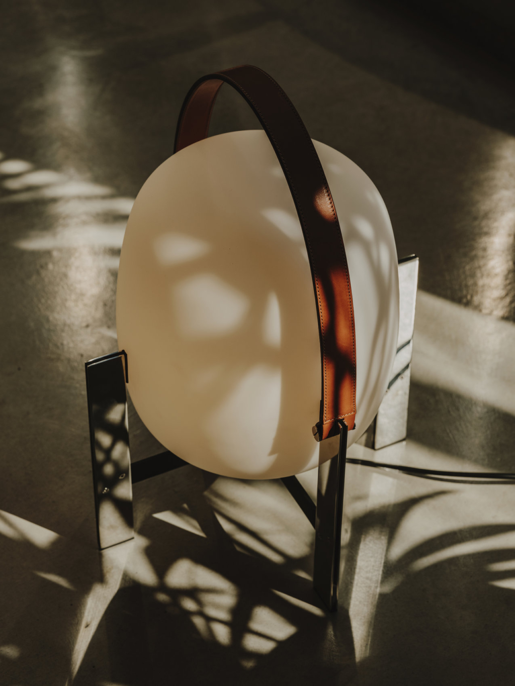 Miguel Milá learned to master the expressiveness of steel by giving it a fragile heart. Strength and emotion, angle and curve. In a duel between strength and fragility, Cesta Metálica comes with or without a soft leather handle, contrasting with the well-aimed severity of the brackets that gently hold the delicate opal globe.