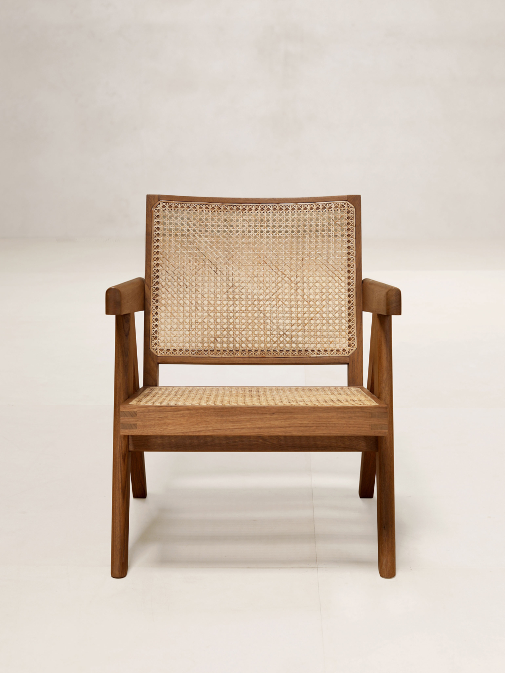 The Easy Armchair - a comfortable lounge chair with signature compass legs - originally designed for offices and residences in Chandigarh and Ahmedabad. Our re-edition is handcrafted using material and techniques similar to the production methods used in the 1950s. The cane seat and back are made of natural rattan cane, peeled and woven meticulously by hand