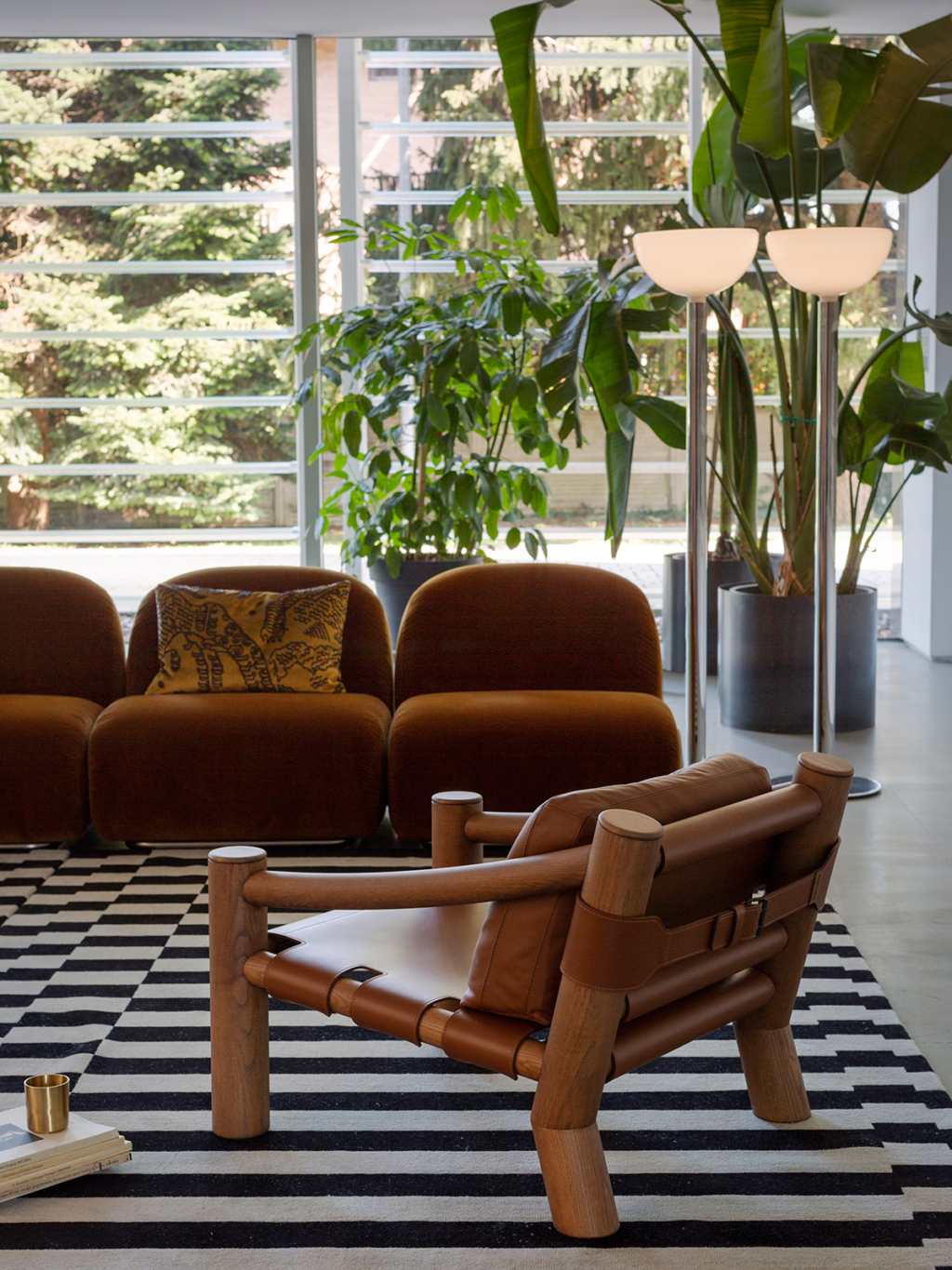 Iconic chair by Lebanese designer Karen Chekerdjian. Elephant’s base is made of turned solid wood, worked and polished to the touch. The frame is made of handcrafted leather, with a very comfortable goose-down padded cushion. Available in tan leather or dark brown, it can be accompanied by an ottoman. Designed with longevity and sustainability in mind, it is suitable for any type of environment.
