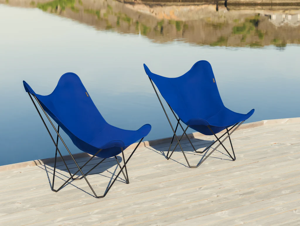 Butterfly Chair made in France by Airborne. Available in different colors and fabrics such as outdoor linens. Structural base in black or stainless steel.