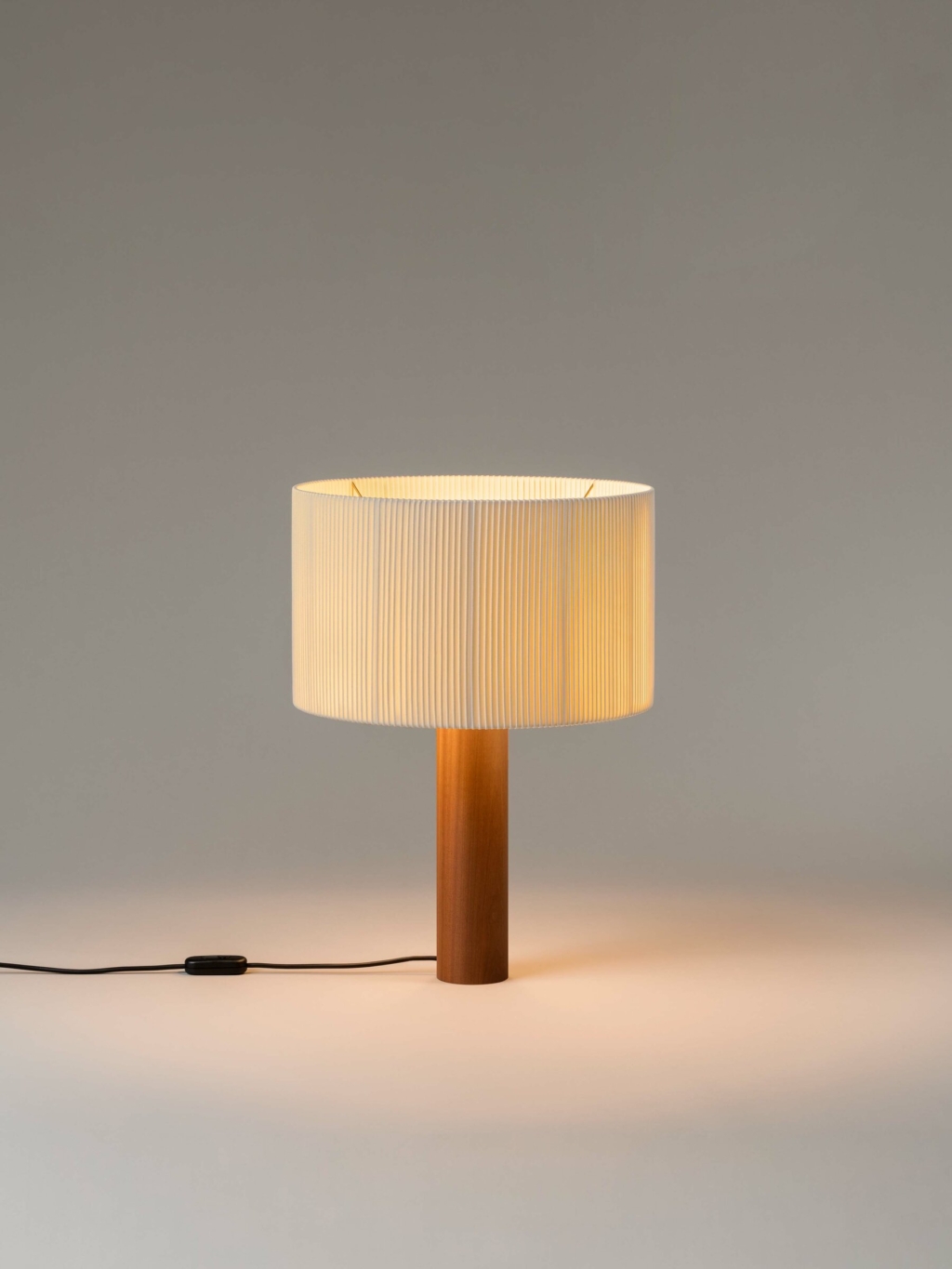 A sturdy wooden cylinder supports a head with three bulbs, surrounded by a generous circular shade. The shade is made from cotton ribbon and has a thread running along the edge, reminiscent of bookbinding, and forming an asymmetry that creates a splendid contrast of light and shadow.